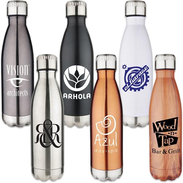 We like stainless-steel tumblers because they keep drinks hot (or cold), and the metallic look makes your logo stand out.